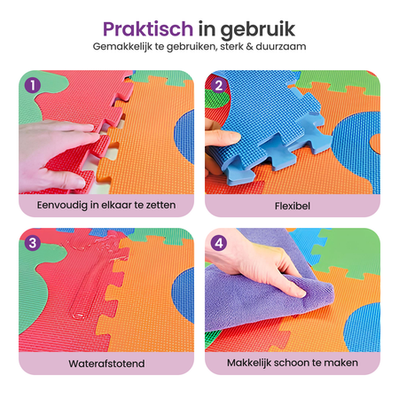 De speelmat is gemaakt van waterafstotend EVA-schuim en is voorzien van een anti-slip oppervlak. Hierdoor kan de speelmat goed tegen een stootje en is de speelmat gemakkelijk schoon te maken. De speelmat voelt daarnaast lekker zacht aan, waardoor het de ideale ondergrond is om samen op te spelen. Zijn de kinderen uitgespeeld? Dan kun je de speelmat gemakkelijk uit elkaar halen en opbergen.