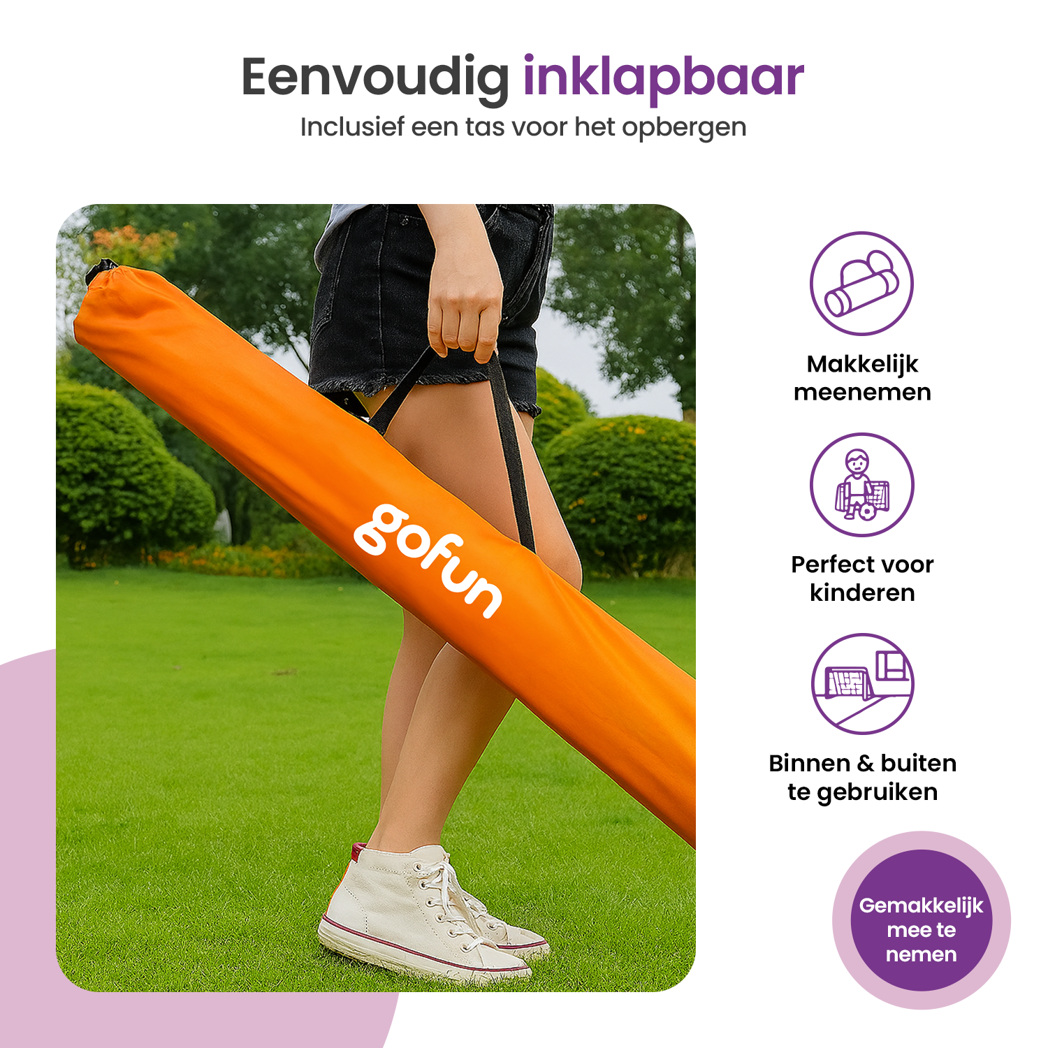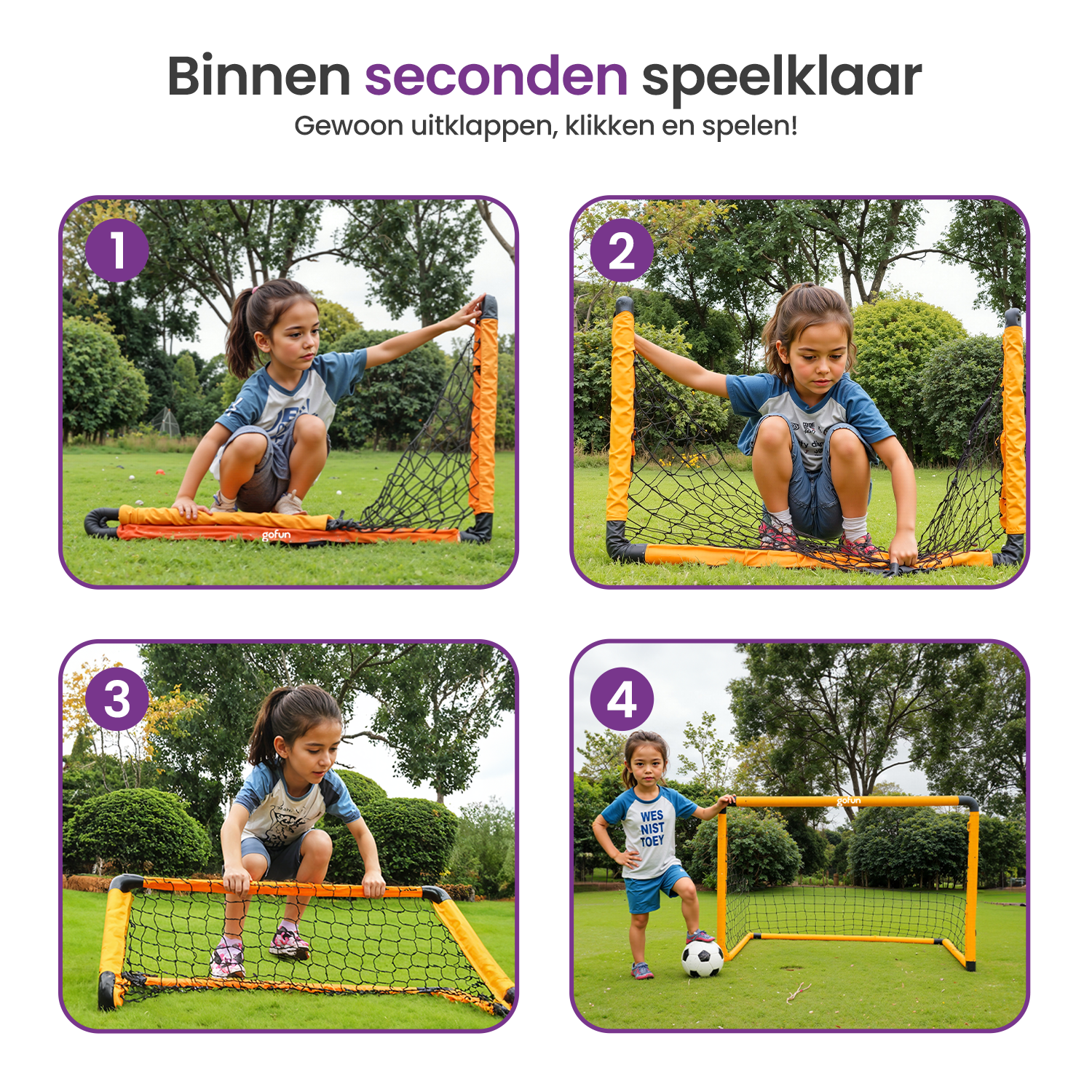 Met de Gofun voetbaldoeltjes verander je elk grasveld, pleintje of park in een voetbalveld. Deze doeltjes voetbal zijn ideaal voor kinderen én volwassenen die altijd en overal een potje willen spelen. Dankzij het slimme kliksysteem sta je binnen enkele seconden klaar om af te trappen.