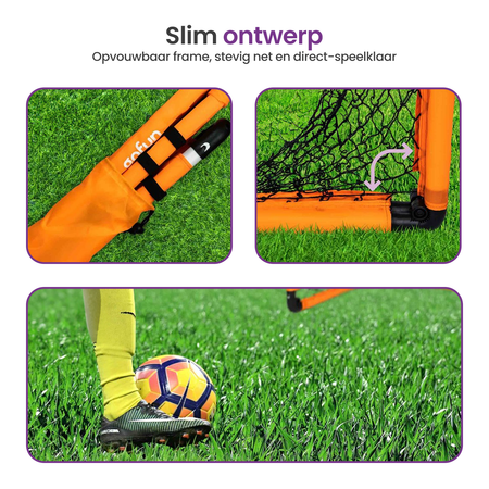 Geen gedoe met losse onderdelen of ingewikkelde montage. Deze opvouwbare voetbaldoeltjes klappen automatisch uit en klikken direct vast. Je haalt ze uit de draagtas, vouwt ze open en kunt meteen beginnen met spelen. Ideaal voor spontaan voetbalplezier.