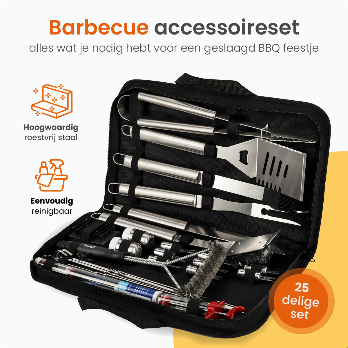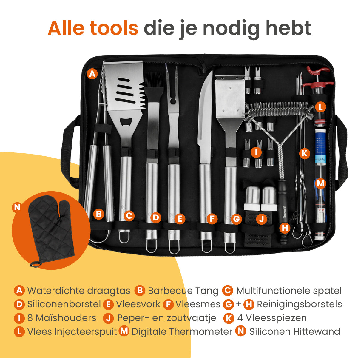 Na afloop van de barbecue wil je al je grillgereedschap netjes en georganiseerd kunnen opbergen. Deze barbecue gereedschapset wordt geleverd met een waterdichte draagtas. In deze tas kun je al jouw barbecue accessoires compact opbergen en meenemen naar de volgende barbecue. De tas is gemaakt van waterdicht materiaal, waardoor je grillgereedschap beschermd is tegen vocht en vuil.