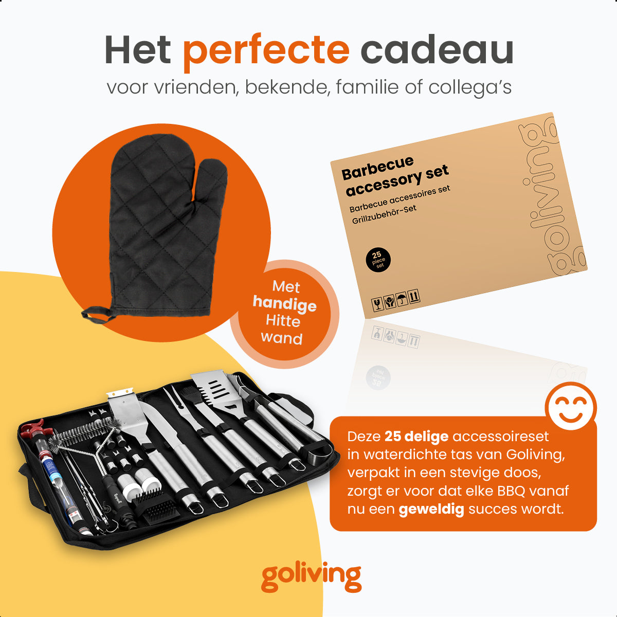 De Goliving barbecue gereedschapset is een complete set met 25 accessoires, waarmee je alles kunt grillen wat je maar wilt. Van sappige steaks tot malse groenten en delicate vis: met deze set heb je het juiste gereedschap voor elke grillklus. Alle accessoires in deze set zijn te vinden in de productfoto's of onderaan deze producttekst.