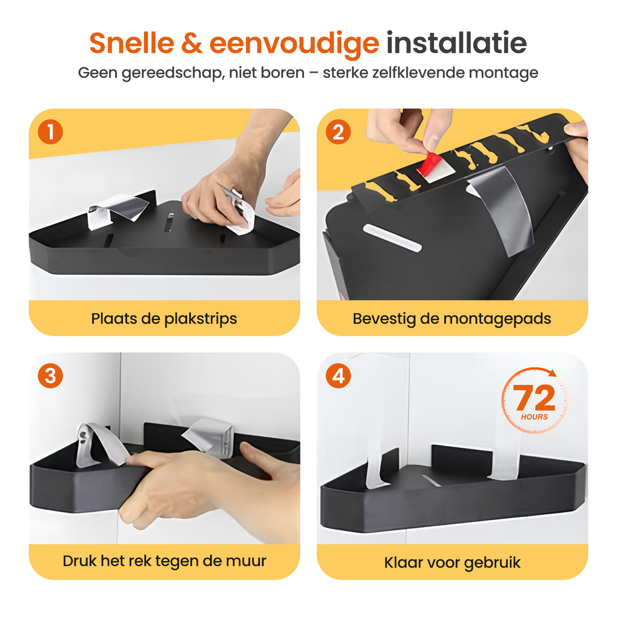 Het doucherekje is zeer eenvoudig te monteren en kan daarnaast opgehangen worden zonder in de muur te hoeven boren. Dit maakt het rekje ook ideaal voor in huurhuizen of voor in badkamers waarbij je de muur graag intact wilt houden. Het rekje is op alle oppervlakken te bevestigen, waaronder tegels, beton, glas, metaal en marmer. Wil je het rekje weer van de muur verwijderen? Dan kun je de lijm opwarmen met behulp van een föhn.