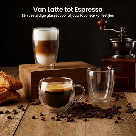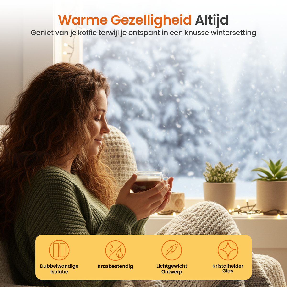Alle glazen in deze glazenset zijn voorzien van een dubbelwandig ontwerp. Het grote voordeel van dit dubbelwandige ontwerp, is dat de inhoud een stuk langer warm blijft. Je hoeft je hierdoor geen zorgen te maken over een kopje koffie dat al een tijdje naast je staat en lauw aan het worden is, de warmte blijft namelijk in het kopje.