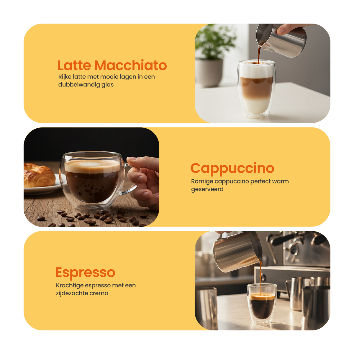 - Geschikt voor verschillende soorten koffie – Wanneer je een goede cappuccino gaat zetten, bestaat deze uit 1/3 espresso, 1/3 warme melk en 1/3 melkschuim. Doordat het cappuccino glas een grotere inhoud heeft, weet je zeker dat je de koffie in de perfecte verhoudingen kunt zetten. Een latte macchiato daarentegen maak je het beste in een hoog glas, welke ook in de set aanwezig is.
