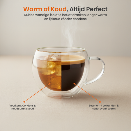 - Ook geschikt voor koude dranken – Drink je liever een ijskoffie of een ander koud drankje? Dankzij het dubbelwandige ontwerp kun je de glazen ook perfect voor koude drankjes met ijsblokjes gebruiken. De ijsblokjes zullen dankzij de isolatie minder snel smelten, waardoor jouw drankje goed koud blijft zonder te verwateren!