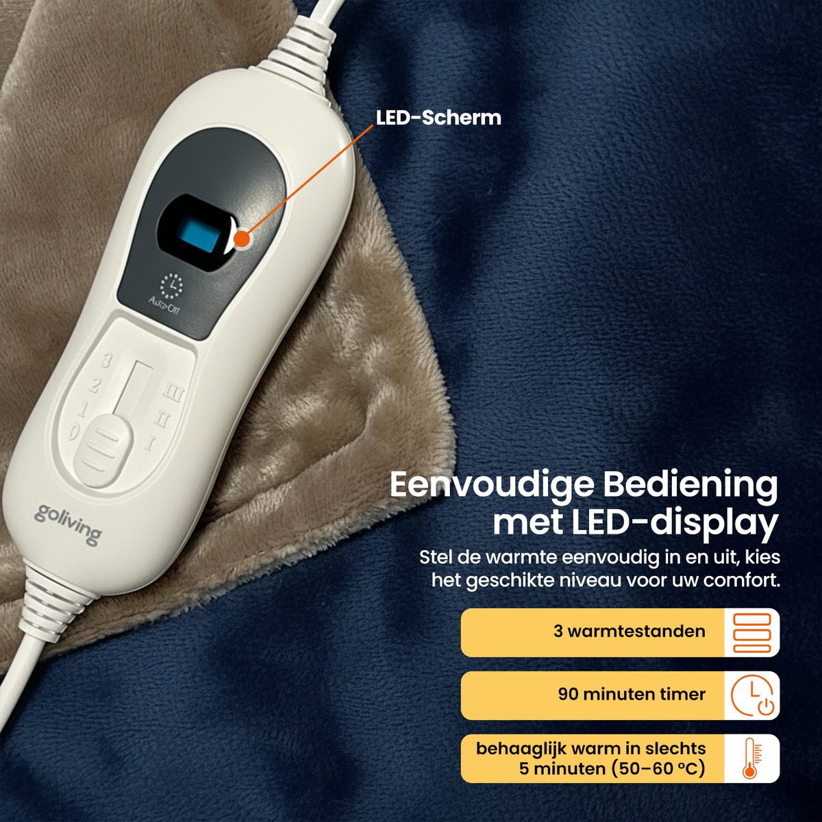 De Goliving elektrische deken biedt warmte zonder hoge energiekosten. Je verwarmt jezelf rechtstreeks, waardoor je minder afhankelijk bent van de centrale verwarming en eenvoudig energie kunt besparen.