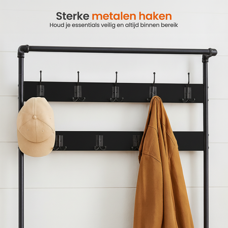 Goliving Kapstok XL – Garderoberek – Schoenenrek – Kledingrek – Staand – Industriële kast – Metaal/Hout – 100 x 41.5 x 182 cm – Zwart