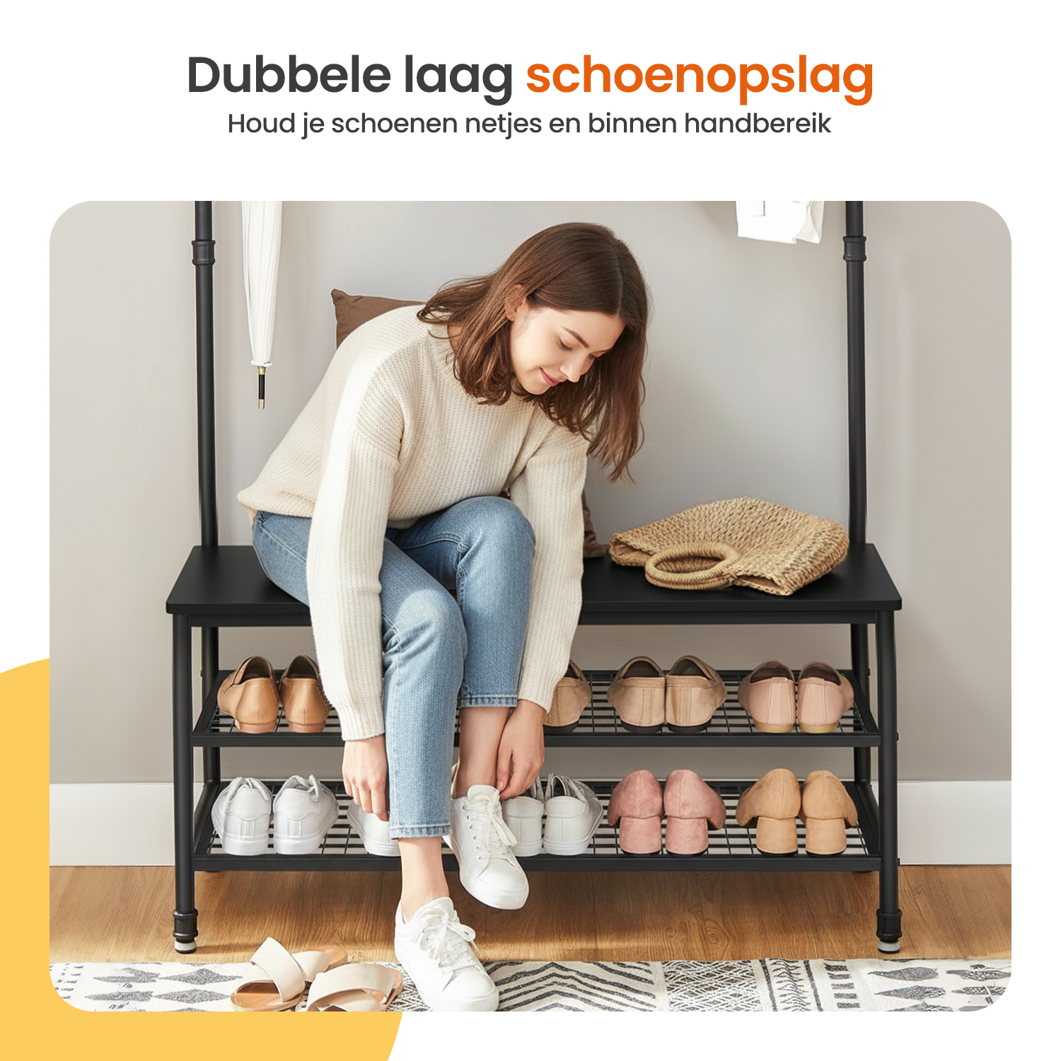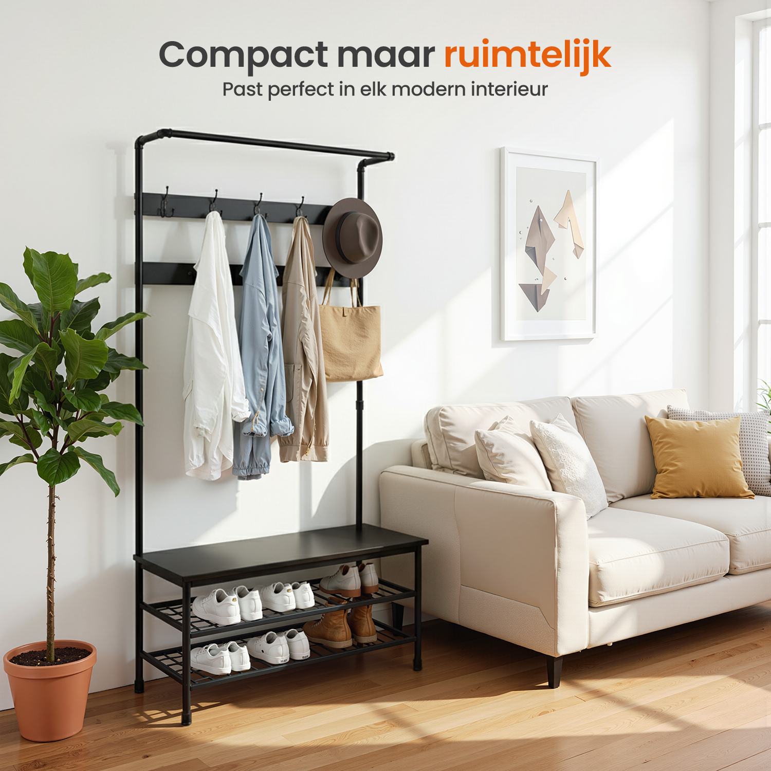 - Functie: Kapstok, garderoberek en schoenenrek in één.