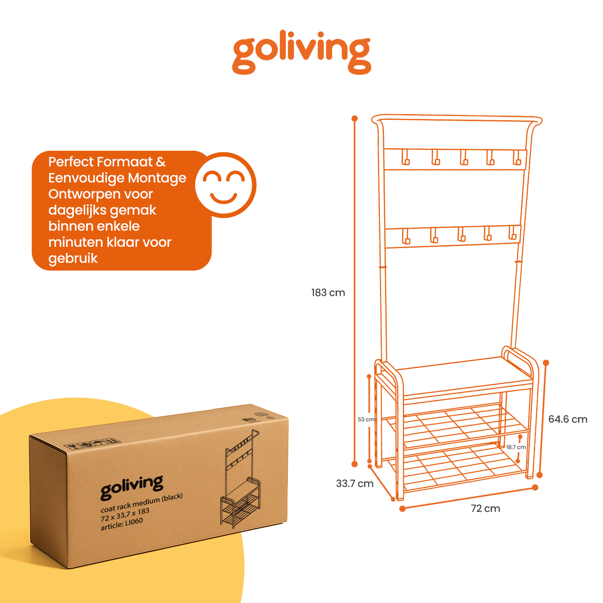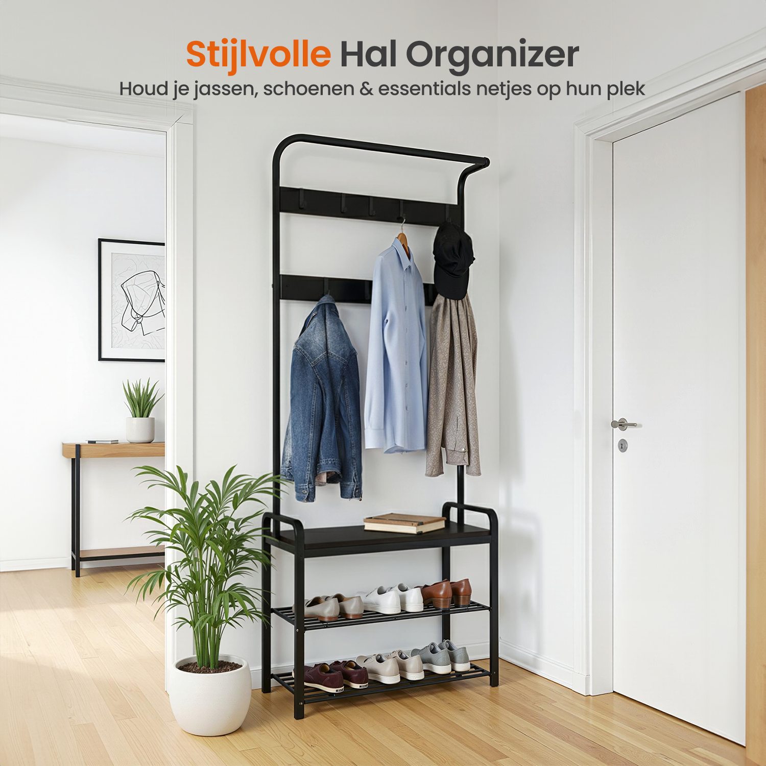 Met deze Goliving kapstok staand met schoenenrek geef je jouw hal of slaapkamer direct rust en overzicht. Jassen, tassen en schoenen krijgen allemaal hun eigen plek, terwijl het moderne zwarte design zorgt voor een warme en stijlvolle uitstraling. Praktisch én een echte eyecatcher in je interieur.