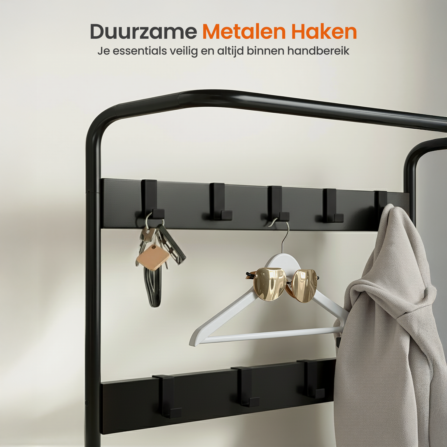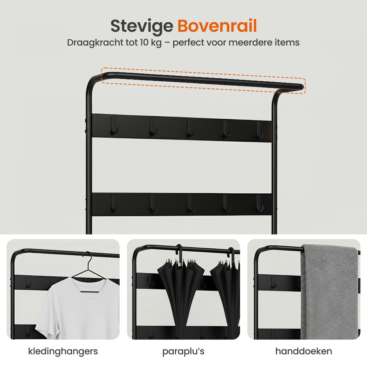 De kapstok wordt geleverd met duidelijke onderdelen en is eenvoudig te monteren. Binnen korte tijd staat hij klaar voor gebruik, zonder ingewikkeld gereedschap of gedoe.