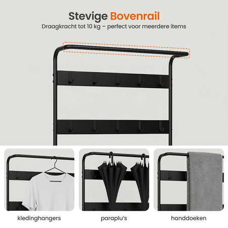 Deze staande kapstok combineert een garderoberek en schoenenrek in één slim ontwerp. Hang je jassen overzichtelijk op en plaats je schoenen netjes onderin, zodat alles direct bij binnenkomst opgeruimd is. Ideaal voor gezinnen, kleine ruimtes of een drukke entree.