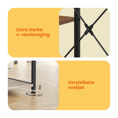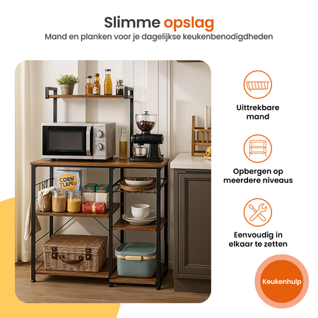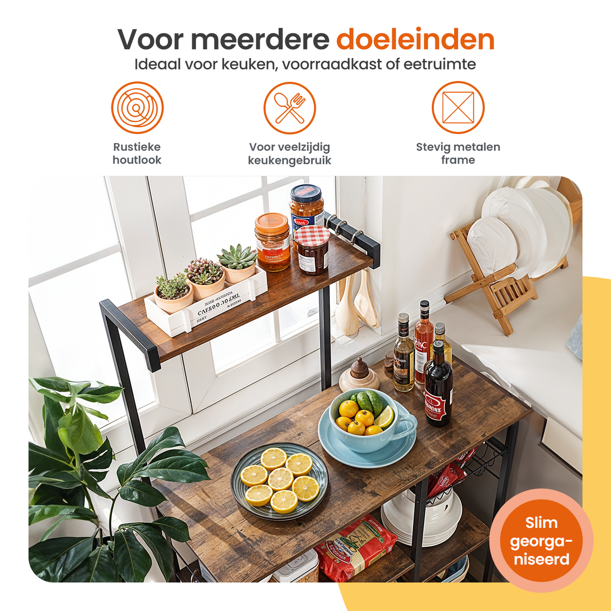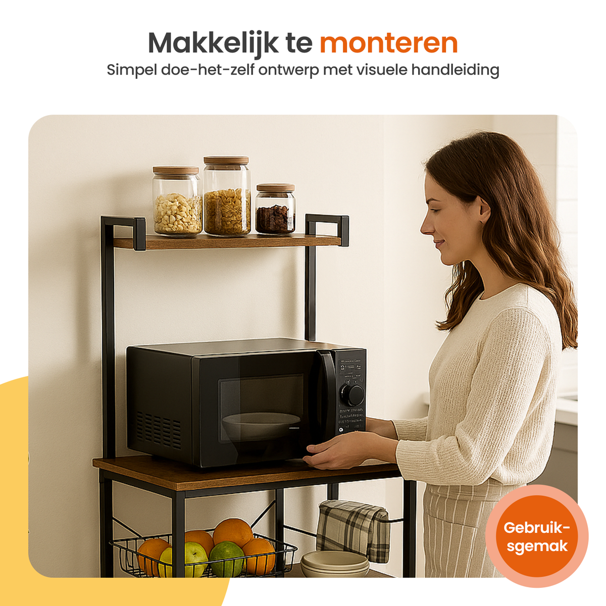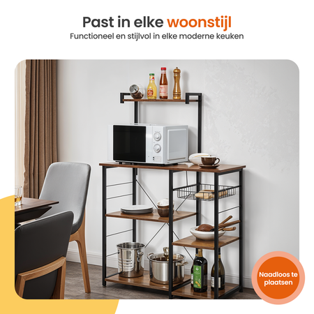 Dankzij de praktische afwerking is het keukenrek eenvoudig schoon te maken. Of je nu met vlekken of stof te maken hebt, het onderhoud is een fluitje van een cent. Zo blijft het rek er altijd netjes uitzien, zonder gedoe.