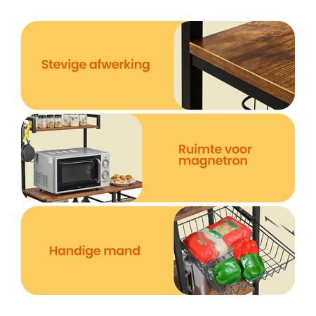 Het Goliving keukenrek is gemaakt van hoogwaardig hout en heeft een robuuste bruin/zwarte powdercoat afwerking. Dit zorgt ervoor dat het rek niet alleen een stoere uitstraling heeft, maar ook stevig en bestand is tegen dagelijks gebruik. Het is een investering in een product dat jarenlang meegaat, zonder in te boeten op stijl of functie.