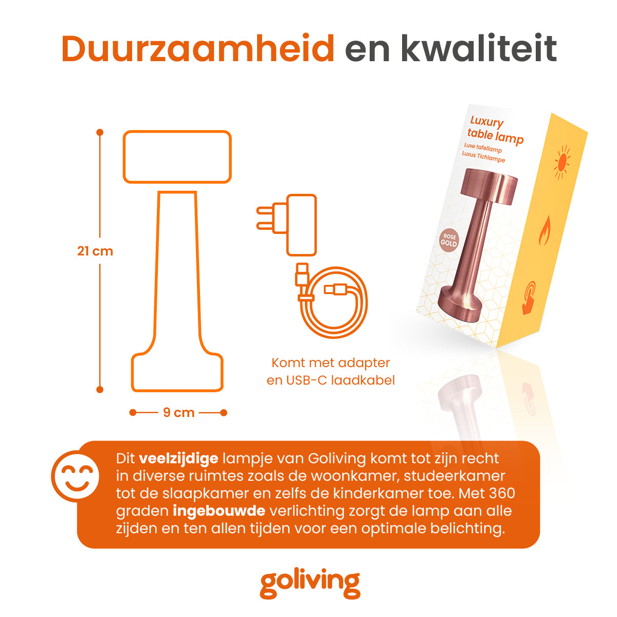 De belangrijkste voordelen van de Goliving tafellamp• Draadloze tafellamp – eenvoudig oplaadbaar via USB-C