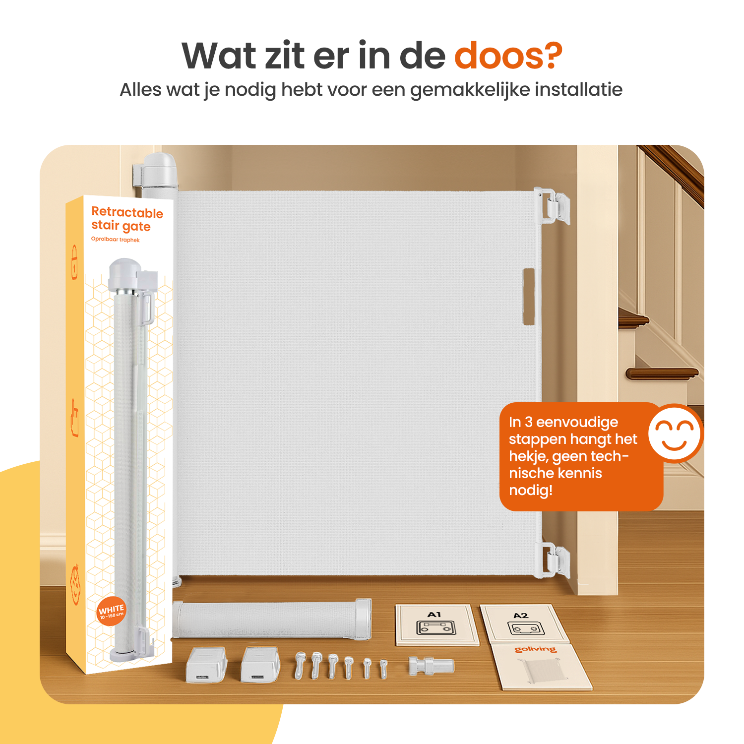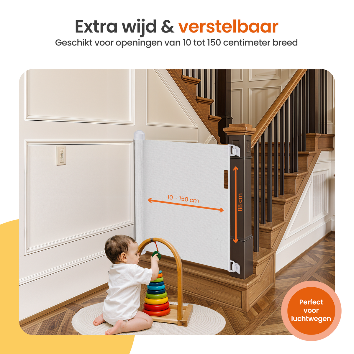 Het Goliving traphek is oprolbaar en daardoor geschikt voor een grote variatie aan doorgangen. Met een hoogte van 80 centimeter en een uitschuifbare breedte van 10 tot 150 centimeter is het ideaal voor trapgaten, gangen en bredere doorgangen waar een standaard traphek niet past. Oprollen gaat soepel en zorgt dat het hekje nauwelijks ruimte inneemt wanneer je het niet gebruikt.