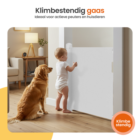 Kinderen houden ervan om te ontdekken en te klimmen. Het stevige mesh materiaal geeft geen houvast en voorkomt dat kinderen omhoog klimmen tegen het traphek. De solide constructie is daarnaast sterk genoeg voor honden die er tegenaan duwen of rennen. Zo blijft je huis veilig voor zowel kind als huisdier.