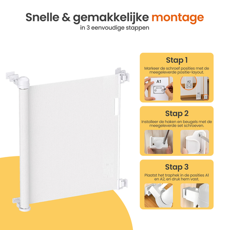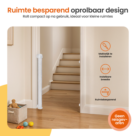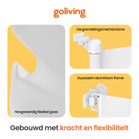 Je huis veilig houden voor je kind of huisdier? Het Goliving oprolbaar traphekje zorgt ervoor dat nieuwsgierige kleintjes en viervoeters niet meer op gevaarlijke plekken komen. Het stevige mesh materiaal, de kindveilige sluiting en het volledig inschuifbare ontwerp maken dit traphek ideaal voor trappen en doorgangen van 10 tot 150 centimeter breed.