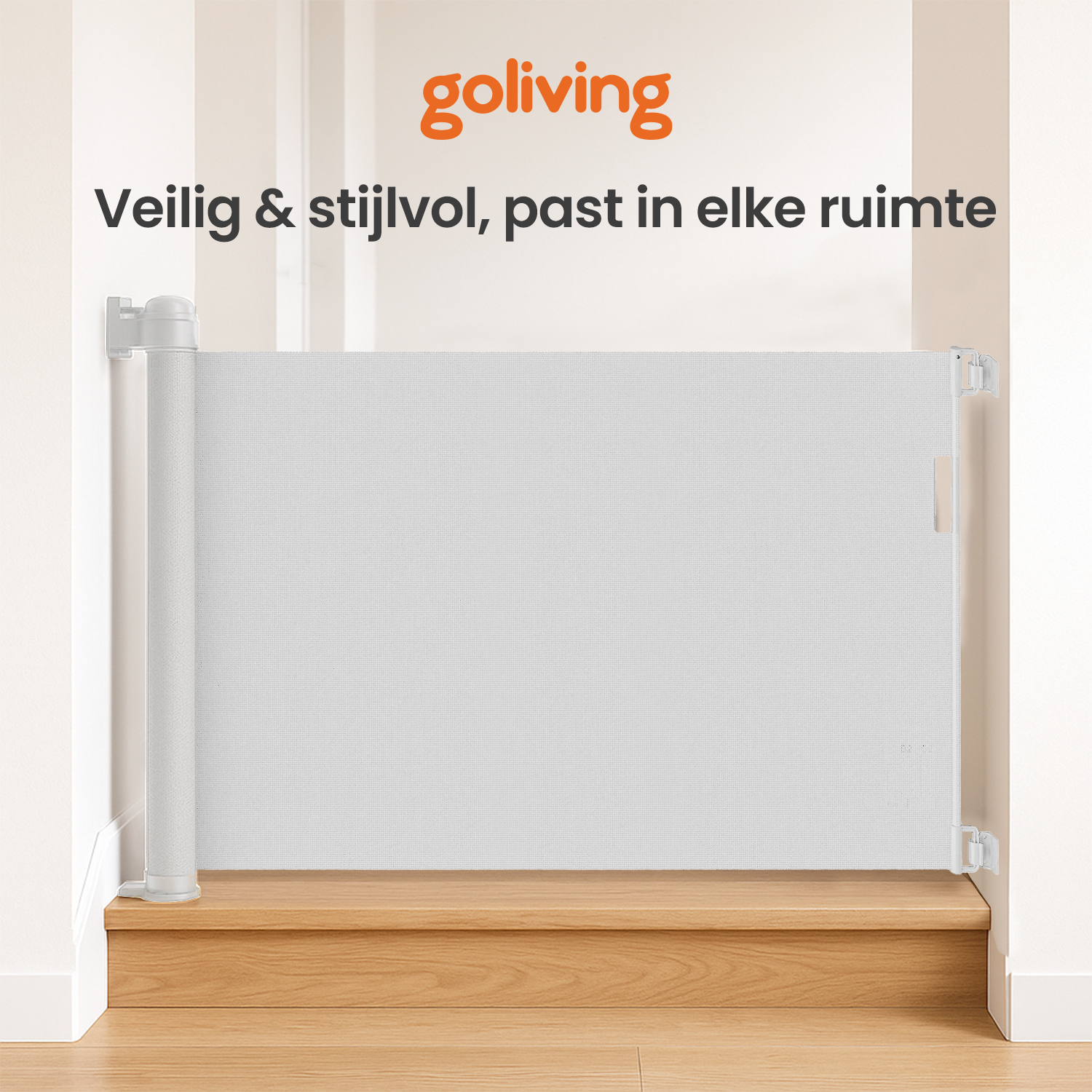 Het Goliving traphek heeft een strak uiterlijk dat past in moderne en klassieke interieurs. Geen drempels, geen zwaaiende deuren en geen grote frames. Wanneer je het hekje niet gebruikt, rol je het volledig op zodat je doorgang weer vrij en ruim oogt.