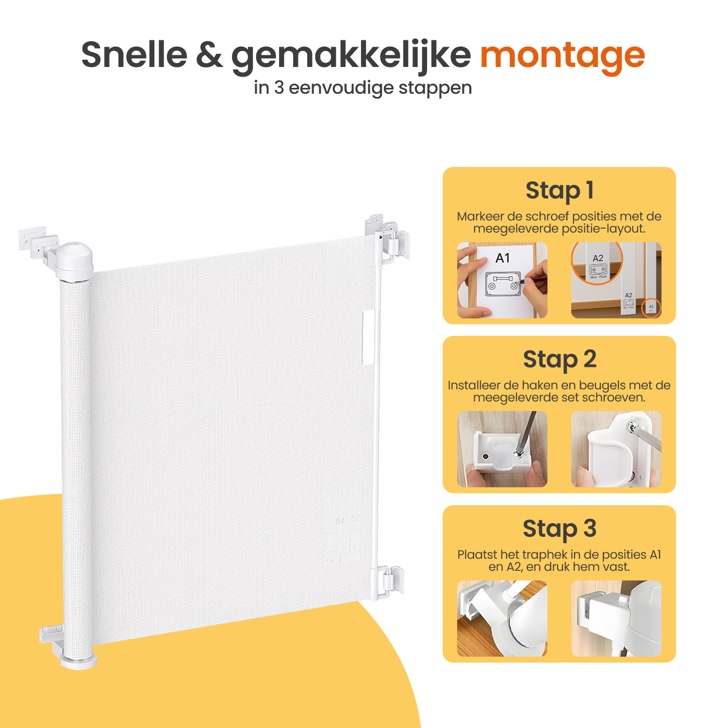 Het traphekje wordt geleverd met schroeven en muurpluggen voor een stevige montage. Binnen enkele eenvoudige stappen is het veiligheidshek geplaatst. Het hekje is zowel links als rechts te monteren en past zich aan aan jouw ruimte zonder ingewikkelde handelingen.