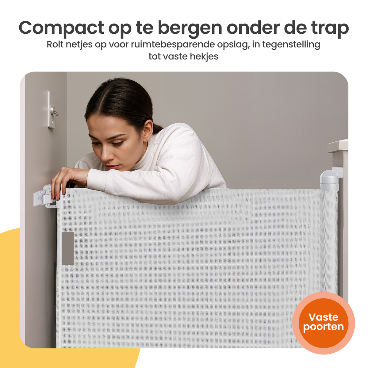 In tegenstelling tot traditionele traphekjes blijft er geen object in de weg staan. Het oprolbare ontwerp zorgt dat je geen last hebt van spijlen, een scharnierdeur of drempel waarover je kunt struikelen. Ideaal voor dagelijks gebruik.