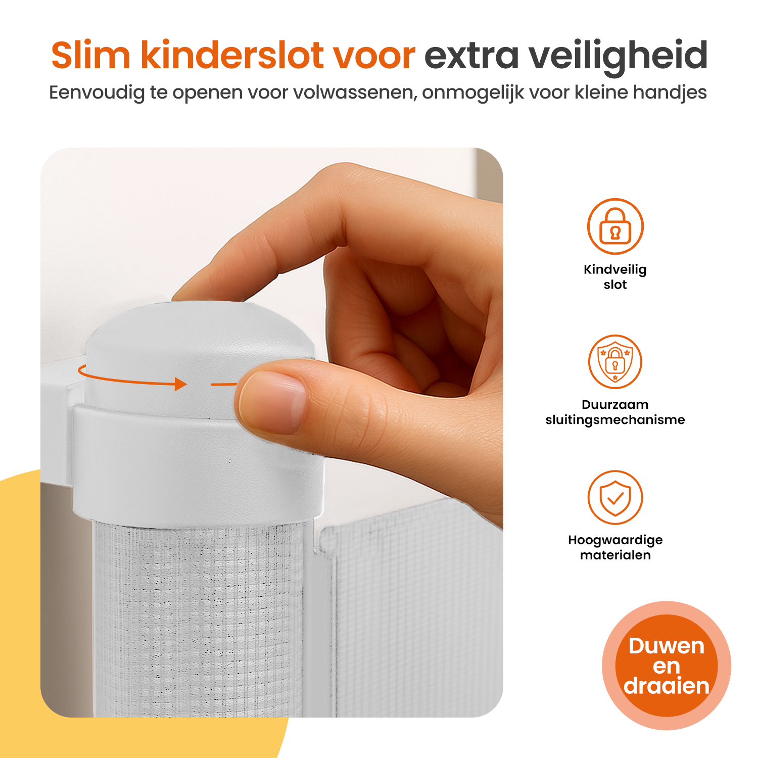 De Push & Turn-sluiting is ontworpen om door kinderen niet te openen. Voor volwassenen werkt het systeem snel en eenvoudig, maar kleine handen krijgen het veiligheidsmechanisme niet los. Een gerust gevoel bij elke doorgang.