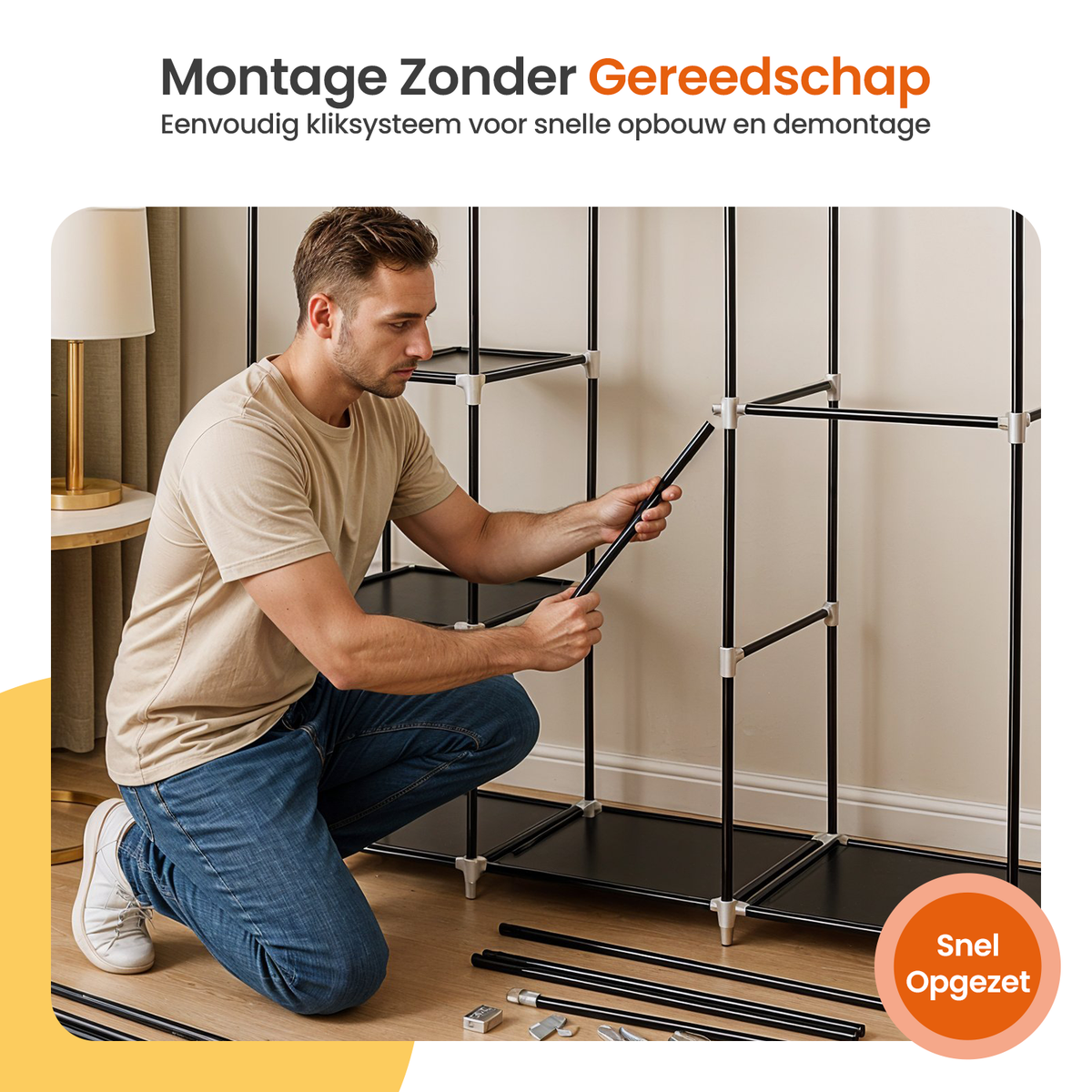 Een kledingkast monteren of demonteren zal voor niemand een favoriet klusje zijn. Maar het hoeft dus helemaal niet moeilijk te zijn, bewijst deze Goliving garderobekast. Het kliksysteem werkt intuïtief, en zelfs met twee linkerhanden zet je deze kast in een mum van tijd in elkaar. Stangen klikken, touwtjes vastknopen, en voilà! Ook uit elkaar halen is zo gedaan.