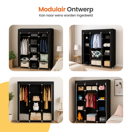 Ook is er gekozen voor een handige combinatie van hang- en legruimte. Van jassen en shirts tot schoenen en accessoires: in de Goliving opvouwbare kledingkast kun je ze allemaal netjes kwijt. Extra mooi meegenomen: je kunt de indeling van de vakken naar eigen inzicht aanpassen. Zo past de kast precies bij jouw wensen.