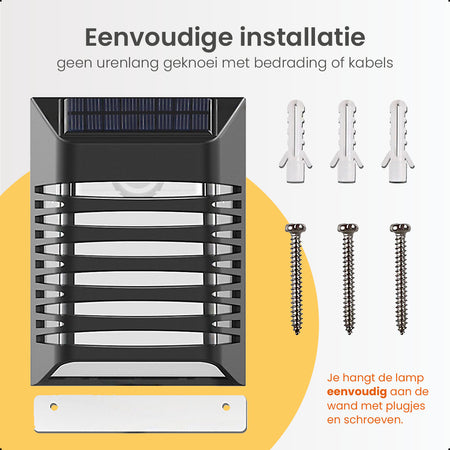 · Eenvoudig te installeren – De solar lamp is zeer eenvoudig te monteren. Het enige wat je hoeft te doen is de juiste plek te kiezen voor de lamp, twee spijkers op de juiste afstand in de muur te slaan en de lamp waterpas op te hangen.