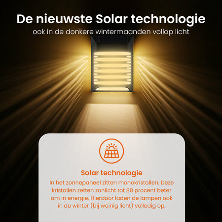 · Volledig waterdicht – De solar wandlamp heeft een volledig IP65 waterdicht ontwerp. Hierdoor hebben regen, sneeuw, vorst en zelfs hitte geen invloed o de lamp.