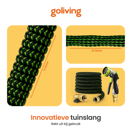 De Goliving tuinslang is erg bijzonder. Hij wordt namelijk tot wel drie keer langer wanneer je het water laat lopen. Zo is hij slechts 10 meter wanneer de slang niet in gebruik is, en rekt hij bij gebruik uit tot wel 30 meter. Drie keer zijn eigen lengte! Daarnaast is er goed nagedacht over het materiaalgebruik: Thermoplastic elastomeer. Dit unieke materiaal zorgt er voor dat de slang nooit in de knoop raakt, en er geen kinken in kunnen komen. Daardoor ben je altijd verzekerd van een