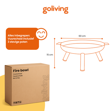 Met de Goliving vuurschaal creëer je in een paar minuten een gezellige vuurplaats. Door zijn ruime 60 cm diameter verspreidt de warmte zich uitstekend, waardoor iedereen er comfortabel omheen kan zitten. Perfect voor lange zomeravonden, koude winterdagen of vakanties aan zee.
