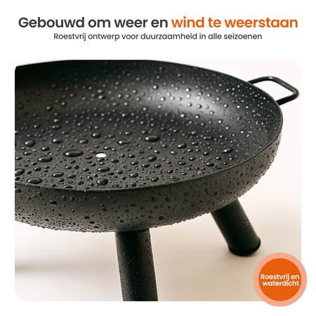 De vuurschaal is gemaakt van dik, hoogwaardig staal dat hittebestendig is en lang meegaat. De zwarte coating geeft niet alleen een moderne look, maar beschermt ook tegen slijtage. Dankzij de stevige poten staat de schaal stabiel op elke ondergrond.