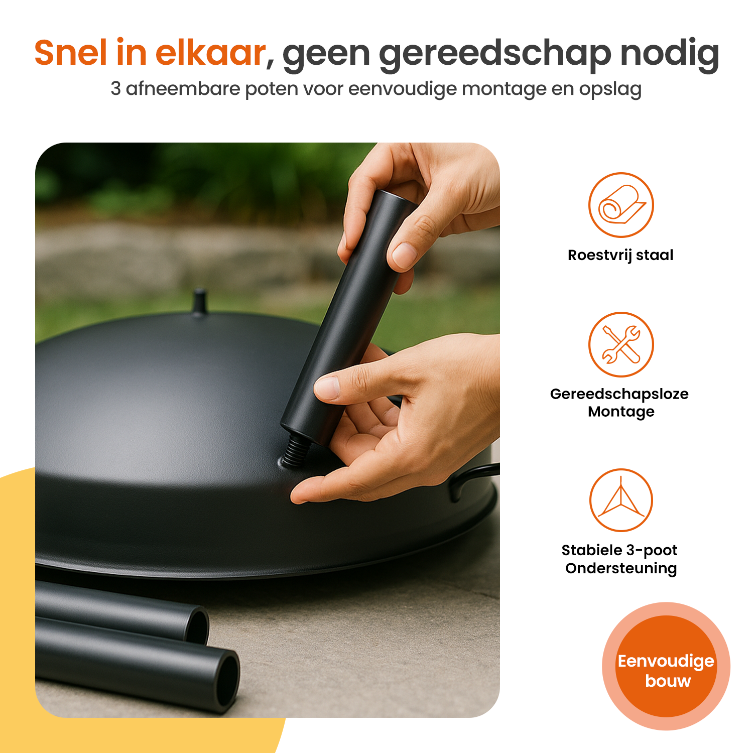 De montage is simpel: je bevestigt de vier poten onder de schaal met de meegeleverde schroeven en je bent klaar. Hout erin, aansteken en genieten maar.