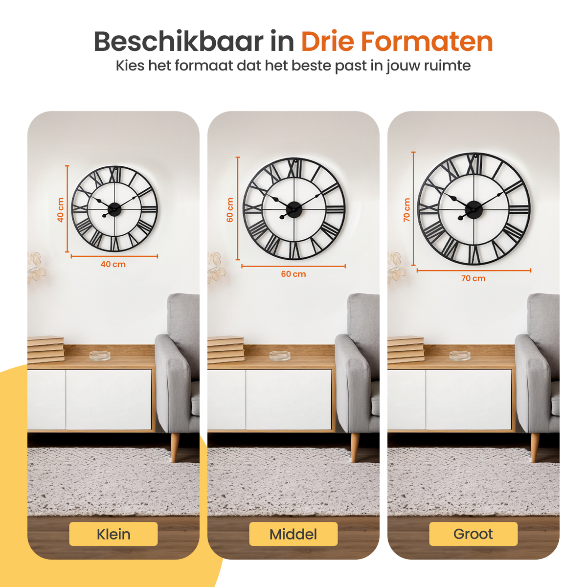 Het open stalen frame maakt de klok subtiel maar krachtig aanwezig in het interieur. Deze wandklok zwart sluit perfect aan bij een industriële of moderne inrichting en vormt een echte blikvanger in woonkamer, keuken, hal of kantoor.