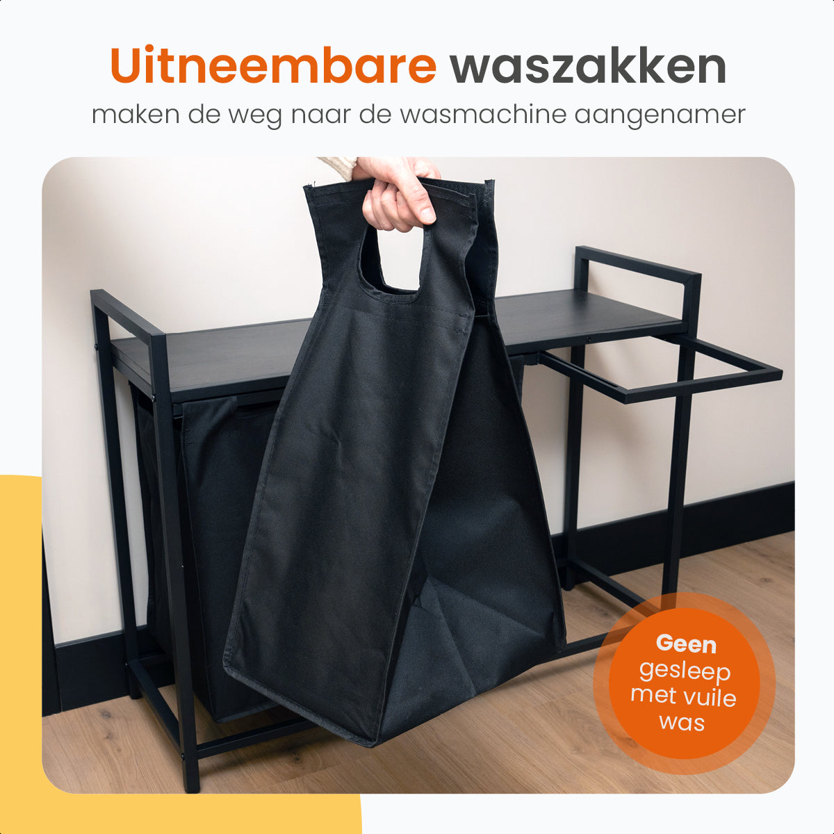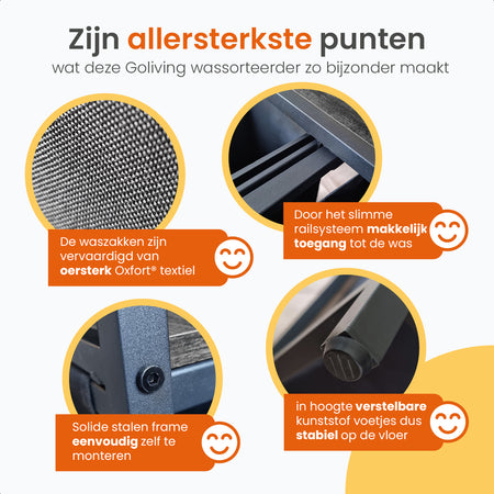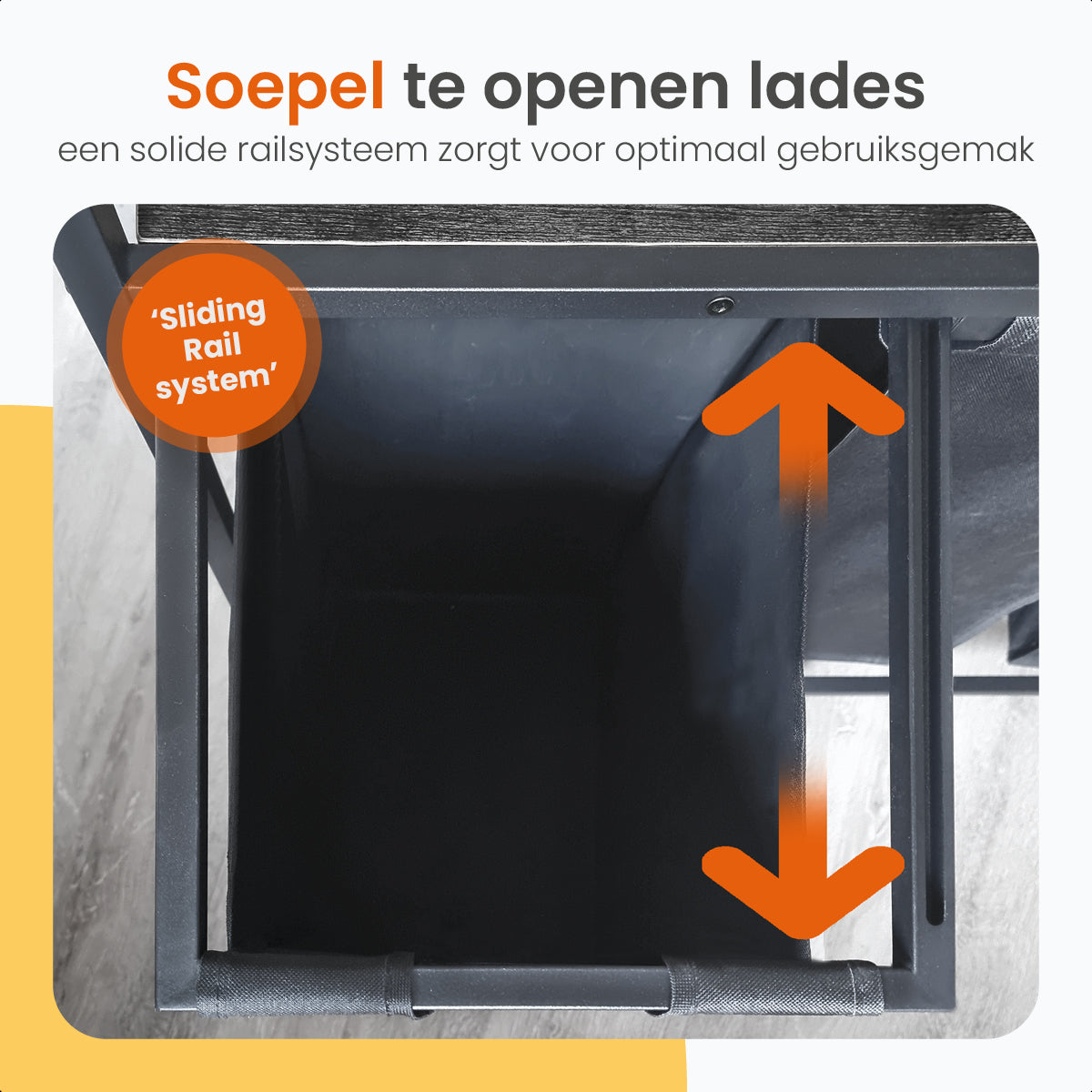 Elke wasmand is voorzien van een zak van Oxfort textiel, wat niet alleen stijlvol is maar ook zorgt voor een onverslijtbare degelijke constructie. Het sliding rail systeem zorgt voor soepele lades die gemakkelijk te openen zijn. De uitneembare waszakken maken het eenvoudig om de was te verzamelen en te transporteren, terwijl de in hoogte verstelbare kunststof voetjes stabiliteit op elke ondergrond garanderen. De wassorteerder biedt niet alleen een praktische oplossing voor het organiseren van je was, maar voegt ook een vleugje stijl toe aan elke wasruimte. Dankzij het eenvoudig reinigbare ontwerp is het onderhoud een fluitje van een cent.