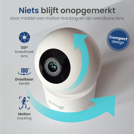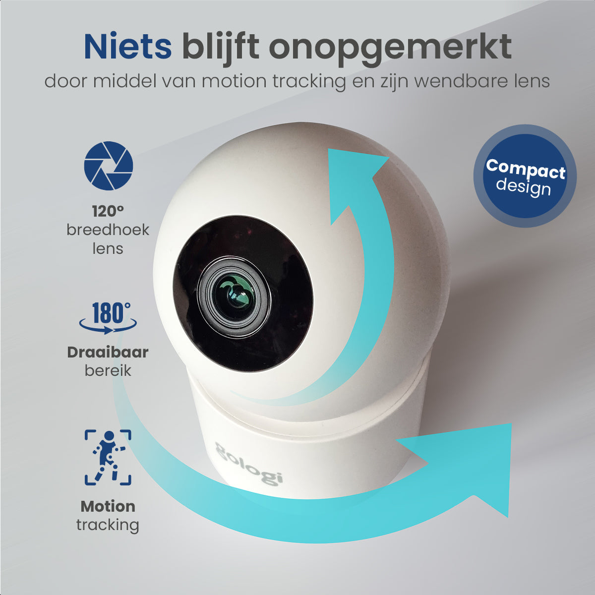 Dankzij het indrukwekkende draaibereik van 180 graden en de 120 graden breedhoeklens ontsnapt er niets aan het oog van de Gologi beveiligingscamera. Het volledige overzicht en de brede kijkhoek zorgen voor een uitgebreide dekking, waardoor je elke hoek van de kamer kunt controleren.
