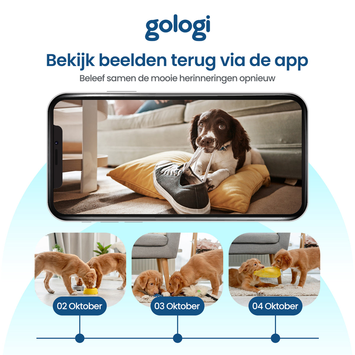 Natuurlijk wil je alle beelden van jouw nieuwe aanwinst ook terug kunnen kijken. Deze kunnen op twee manieren worden opgeslagen. De Gologi camera heeft ruimte voor een micro SD kaart van maarliefst 64GB, waar je honderden uren aan materiaal op kwijt kunt. Wil je de beelden liever altijd bij de hand houden? Dan kun je kiezen voor online cloudopslag. Zo kun je de gemaakte beelden op elk moment van de dag terugkijken op jouw telefoon of tablet.