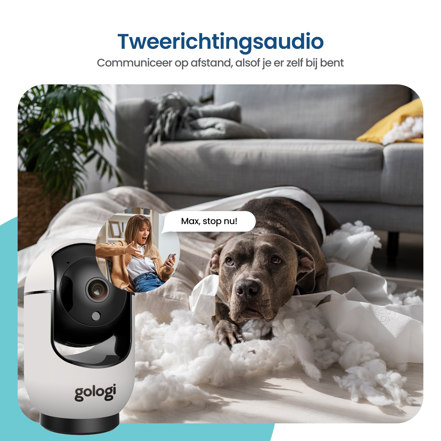 Het liefst zouden we onze huisdieren nooit verlaten. Helaas kunnen we niet altijd bij onze viervoeters in de buurt zijn om op ze te letten. Gelukkig biedt de huisdiercamera van Gologi uitkomst! Met deze slimme camera kun je op elk moment van de dag checken hoe het met ze gaat, gewoon via je telefoon. Door de two-way audio functionaliteit, kun je zelfs met ze communiceren. Handig!