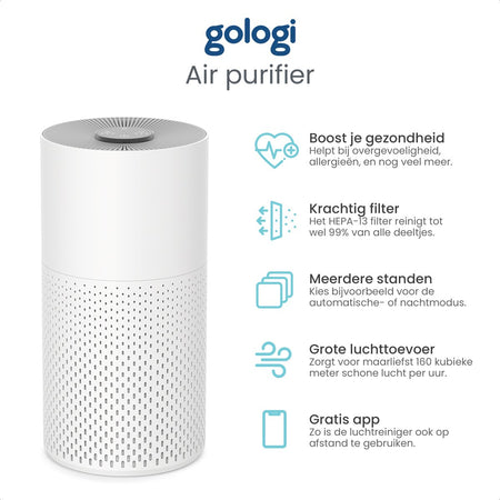 Verwijder tot wel 99,95% van de bacteriën, pollen, virussen en stof uit je leefomgeving met de Gologi luchtreiniger. Dankzij de geavanceerde HEPA 13 filter wordt bijna alle vervuilde lucht uit je huis gefilterd, wat bijdraagt aan het verminderen van irritaties aan de luchtwegen of verkoudheden. Bovendien maakt de handige Gologi app het mogelijk om eenvoudig de luchtkwaliteit te monitoren en het apparaat te besturen vanaf je smartphone, waardoor je altijd en overal controle hebt over een gezondere binnenlucht.
