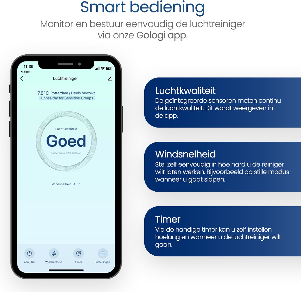 Zit je even niet in de buurt van de luchtreiniger, maar wil je wel graag aanzetten of de luchtkwaliteit meten? Dat is voor de Gologi luchtreiniger geen probleem! Deze luchtreiniger is namelijk op afstand in te stellen met een eigen Nederlandse Gologi app. Met de app kun je de snelheid regelen, kwaliteit meten en de heater aan en uit zetten. Je hoeft hiervoor niet op te staan.