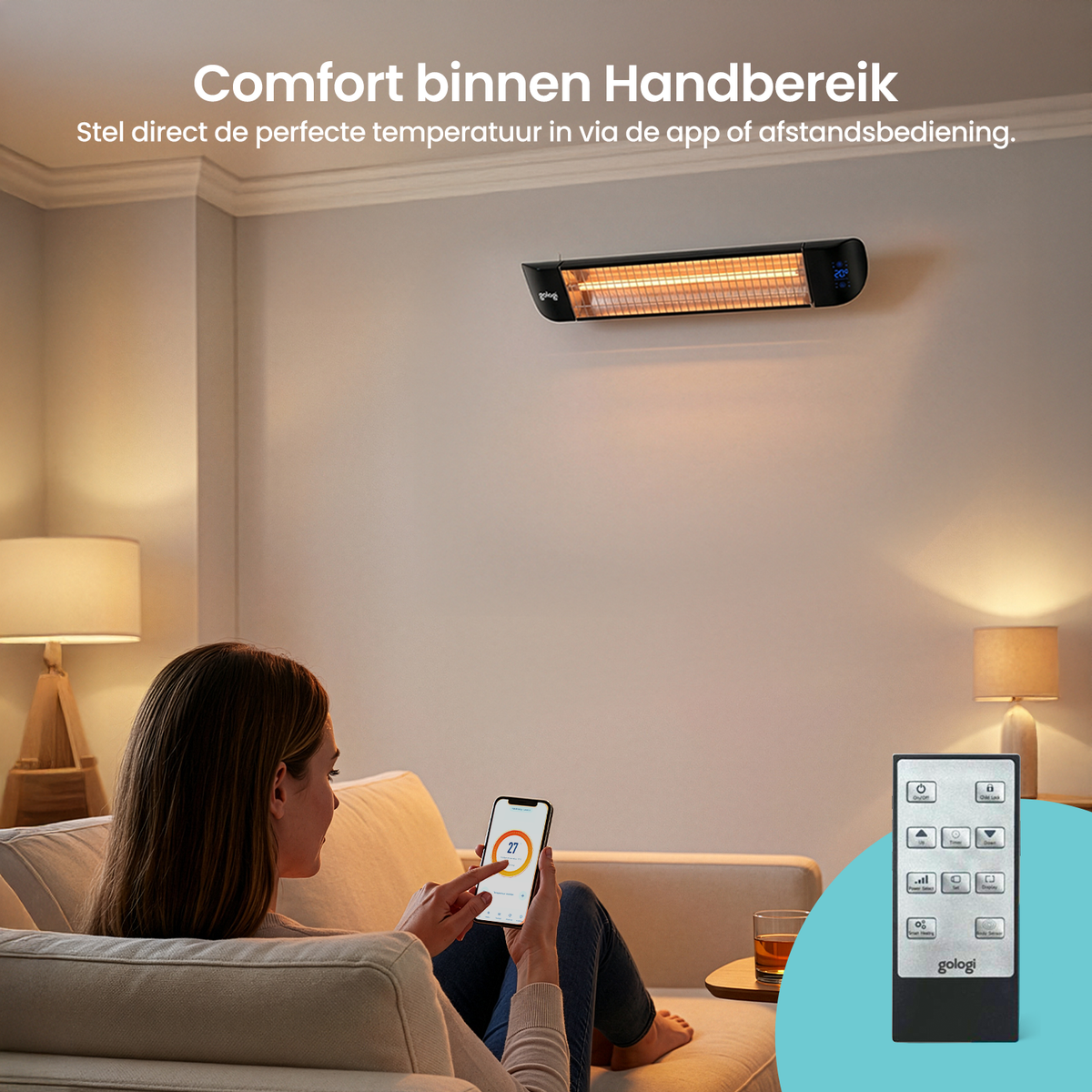 De bediening van deze terrasverwarmer verloopt via een afstandbediening of de handige Gologi app. Hiermee kun je de kachel op twee manieren instellen, waardoor je niet hoeft op te staan om de temperatuur aan te passen.