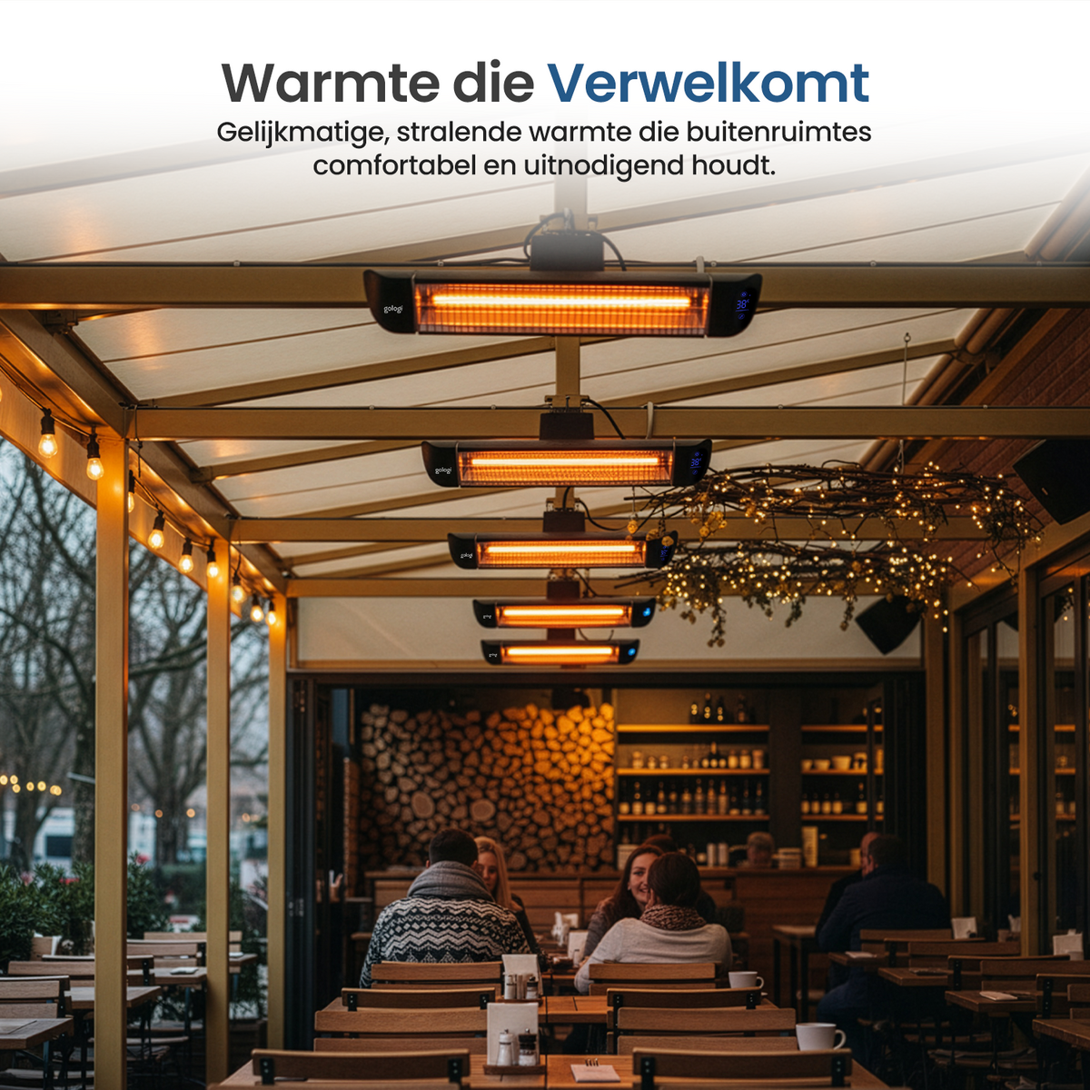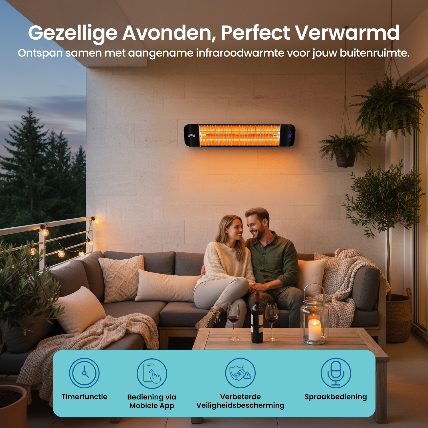 Wil jij nog langer van de avonden in jouw tuin kunnen genieten? Dan is deze terrasverwarmer perfect voor jou! Met deze terrasverwarmer zorg je ervoor dat jij er altijd comfortabel en warm bij zit. De terrasheater heeft een vermogen van 2000W en is eenvoudig te bedienen via de Gologi app of via de meegeleverde afstandsbediening.
