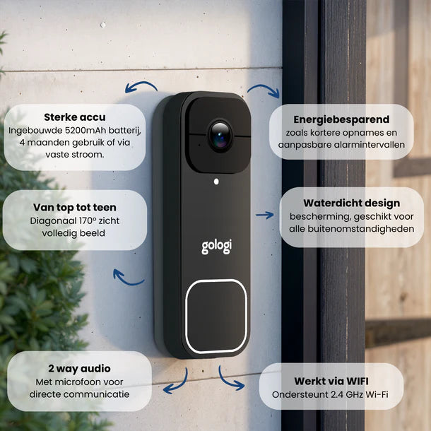 Gologi Video Deurbel - Slimme Deurbel met Camera en WiFi - HD Video Kwaliteit - Draadloos op Accu - Inclusief Muurbeugel en Chime - Night Vision - Waterdicht - Zwart