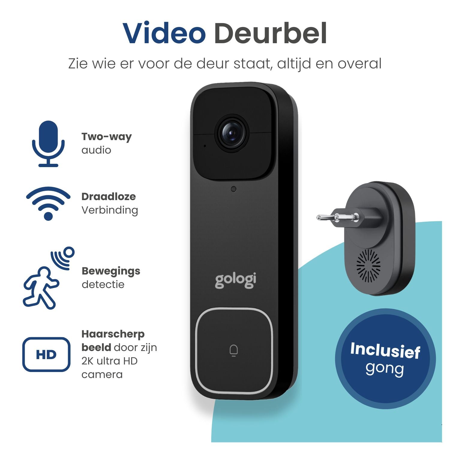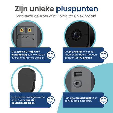 De Gologi video deurbel wordt geleverd met een handige gong en muurbeugel, waardoor je hem eenvoudig kunt installeren en meteen in gebruik kunt nemen. De gong zorgt ervoor dat je altijd hoort wanneer er iemand voor de deur staat, ook als je je telefoon even niet bij de hand hebt.