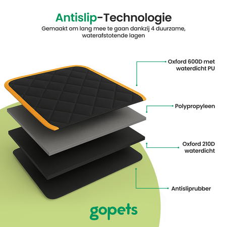 Over het materiaal is goed nagedacht. De toplaag is voorzien van een anti-slip coating, zodat jouw hond meer grip heeft wanneer de auto in beweging is. Daarnaast is het 600D Oxford polyester van nature waterafstotend. Dit betekent dat kleine ongelukjes niet in het kleed, of de achterbank trekken. Wordt het hondenkleed vies door bijvoorbeeld modderige pootjes? Dan stop je hem gewoon in de wasmachine. Zo blijft het hondendeken altijd fris.